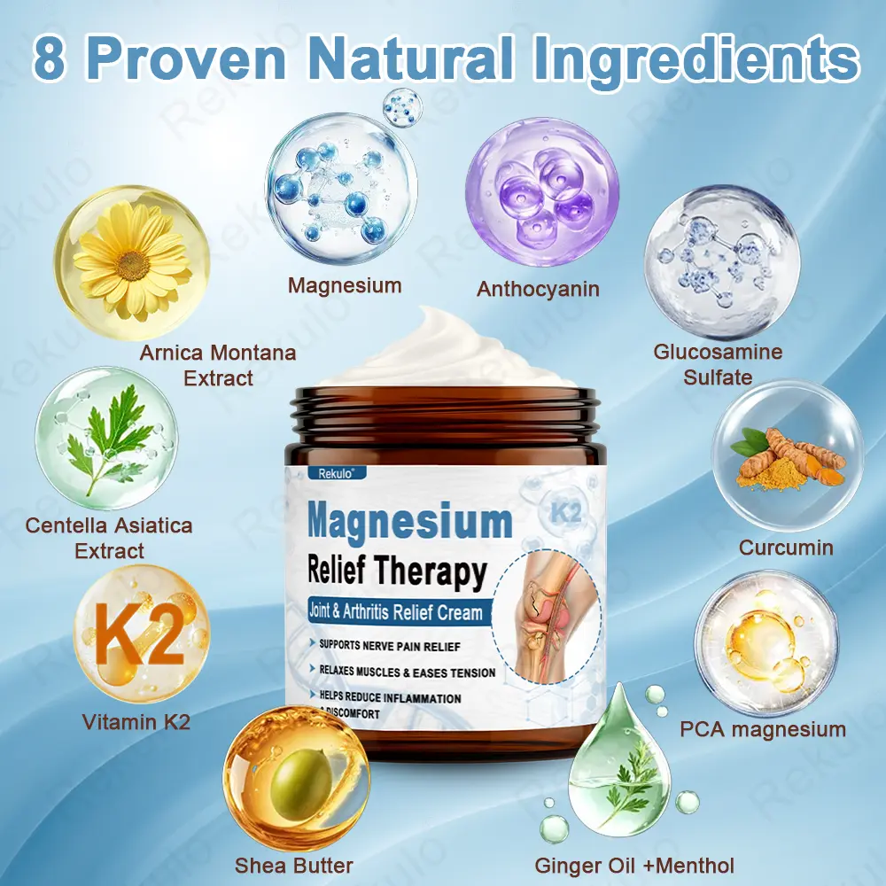 Rekulo® Magnesium Pain Healing Bone Cream can be used in orthopedic rehabilitation for a variety of musculoskeletal and nerve-related pain conditions. It penetrates deeply into local tissues to relieve pain and stiffness caused by arthritis, reduce inflammation and swelling from bone bruises, sprains, or nerve compression, and promote blood circulation and tissue repair. This helps improve joint mobility and shortens recovery time. Whether it’s osteoarthritis, frozen shoulder, cervical spondylosis, sciatica, or post-surgical and post-exercise muscle tension and soreness, consistent use can provide noticeable relief and support functional recovery.
